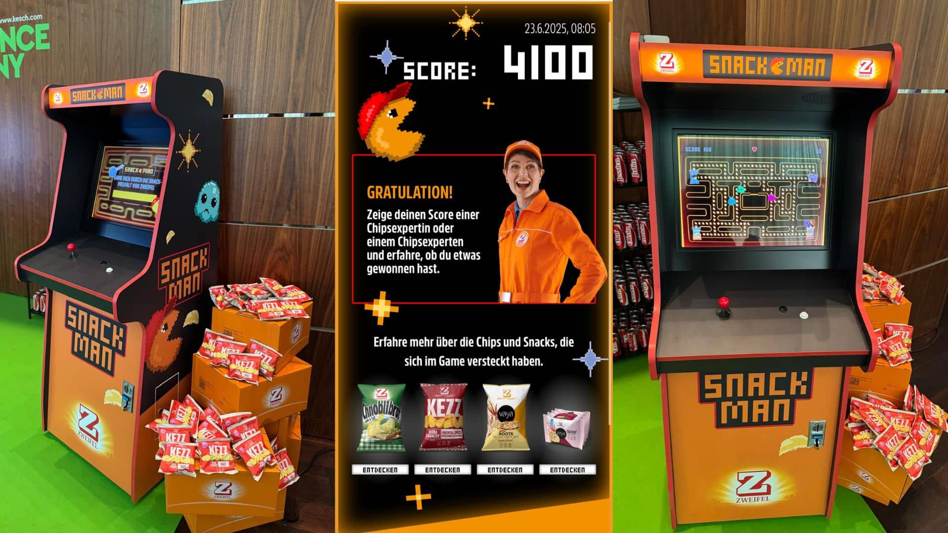 Mit dem Snack-Man hat Zweifel einen unverwechselbaren Eyecatcher geschaffen, der klassisches Arcade-Feeling mit moderner Brand Activation verbindet. Der Automat ist nicht nur optisch ein Highlight, sondern auch ein interaktives Markenerlebnis, das an zahlreichen Standorten – von Supermärkten bis zu Festivals – Besucher:innen spielerisch mit der Zweifel Markenwelt verbindet. KESCH konzipierte, realisierte und betreut das Projekt als umfassende POS- und Eventlösung mit hohem Wiedererkennungswert.